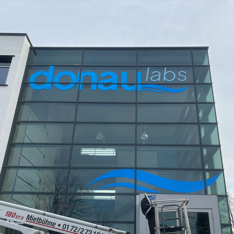 Für den Unternehmensstandort von donauLabs in Neustadt an der Donau haben wir eine umfassende Standortkennzeichnung umgesetzt. Dazu zählen großformatige Firmenschilder am Eingangsbereich, ein auffälliges Außenschild sowie eine hochwertige Glasfassaden-Beklebung.