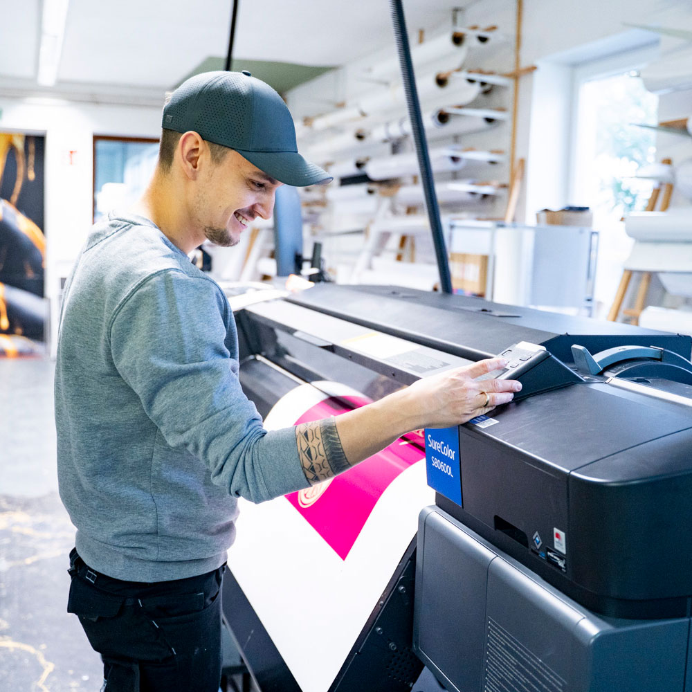 Großflächige Drucke für Fassaden, Bauzäune, Messen, POS oder Innenräume. Passende Materialien und Konfektion sorgen dafür, dass Formate direkt einsatzbereit geliefert werden.